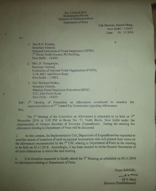 Sub: Withdrawal of the proposed indefinite hunger fast in front of Dak Bhawan from 3rd November, 2016 and two days strike on 9th & 10th November 2016